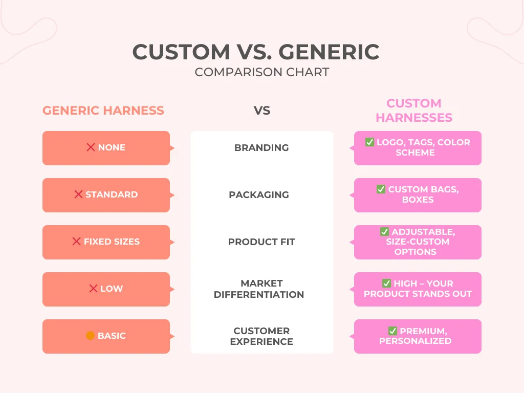 Generic harnesses are mass-produced with no brand identity, fixed colors, and limited packaging—anyone can sell the same item.